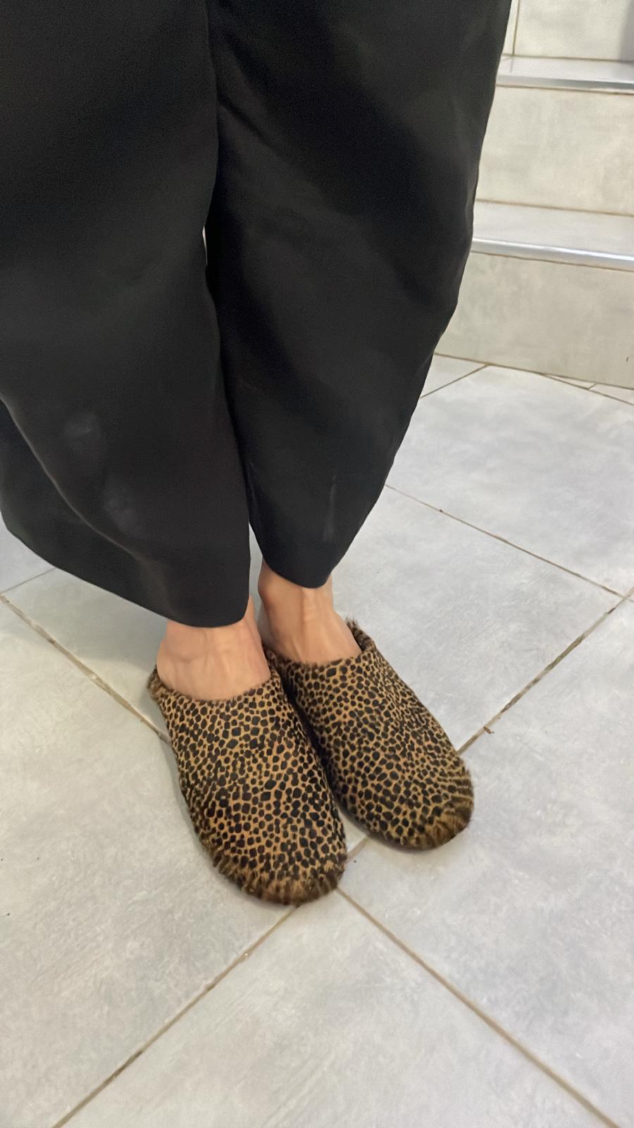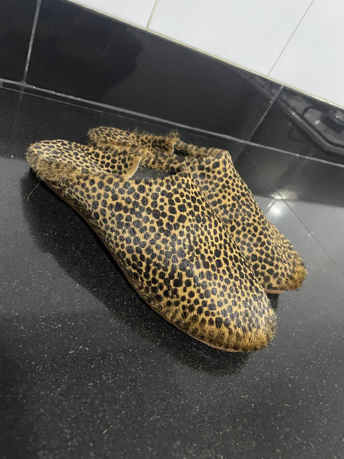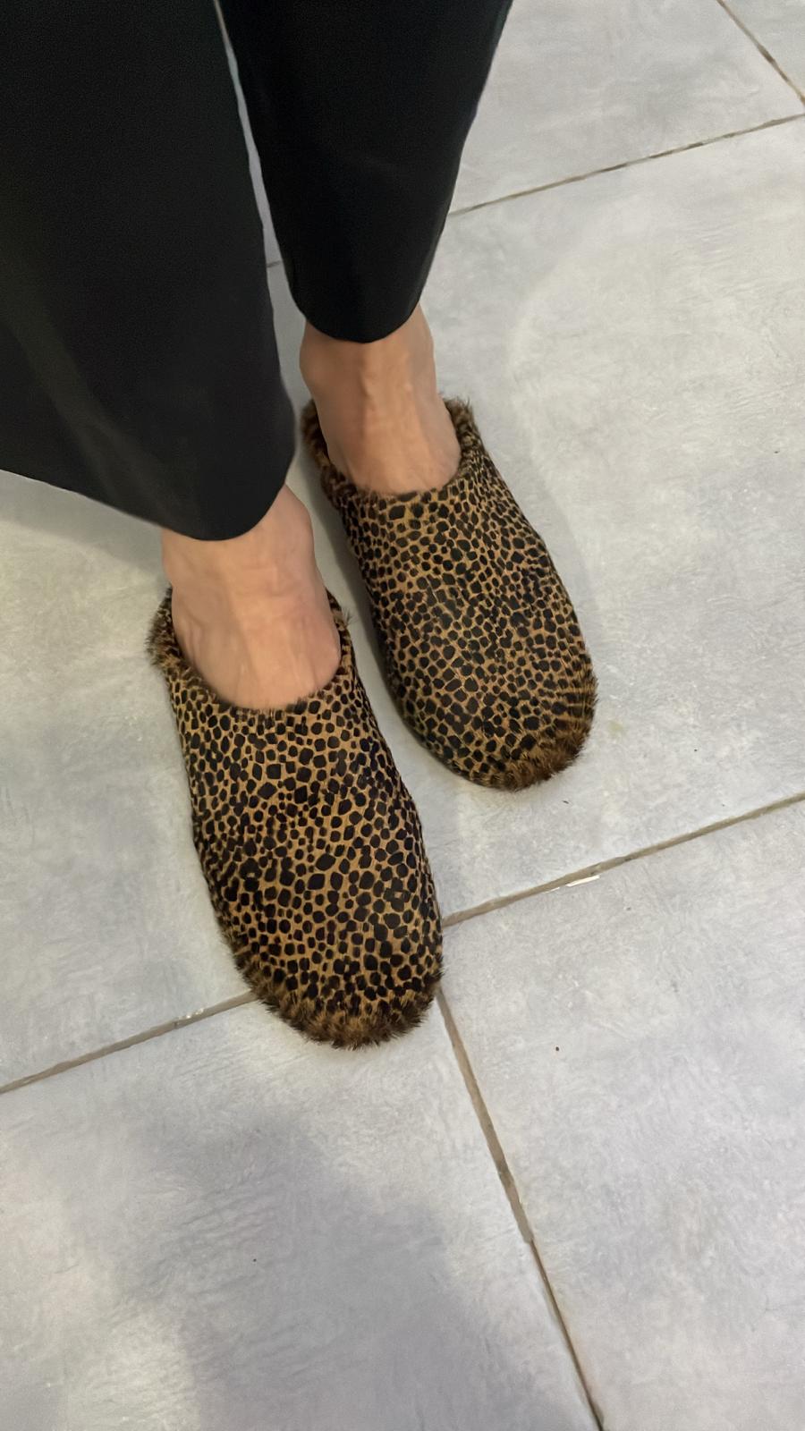 Babouche en cuir et peau de vache imprimé léopard, élégante et confortable.Peut être portée en intérieur comme en extérieur grâce à sa semelle cuir.