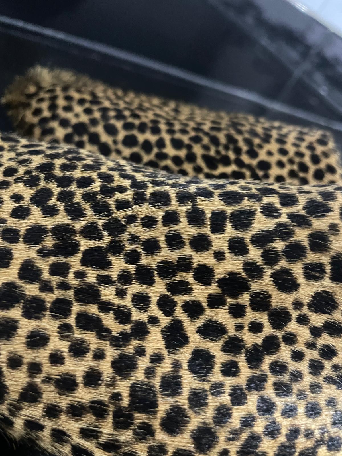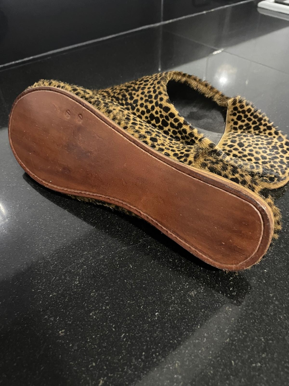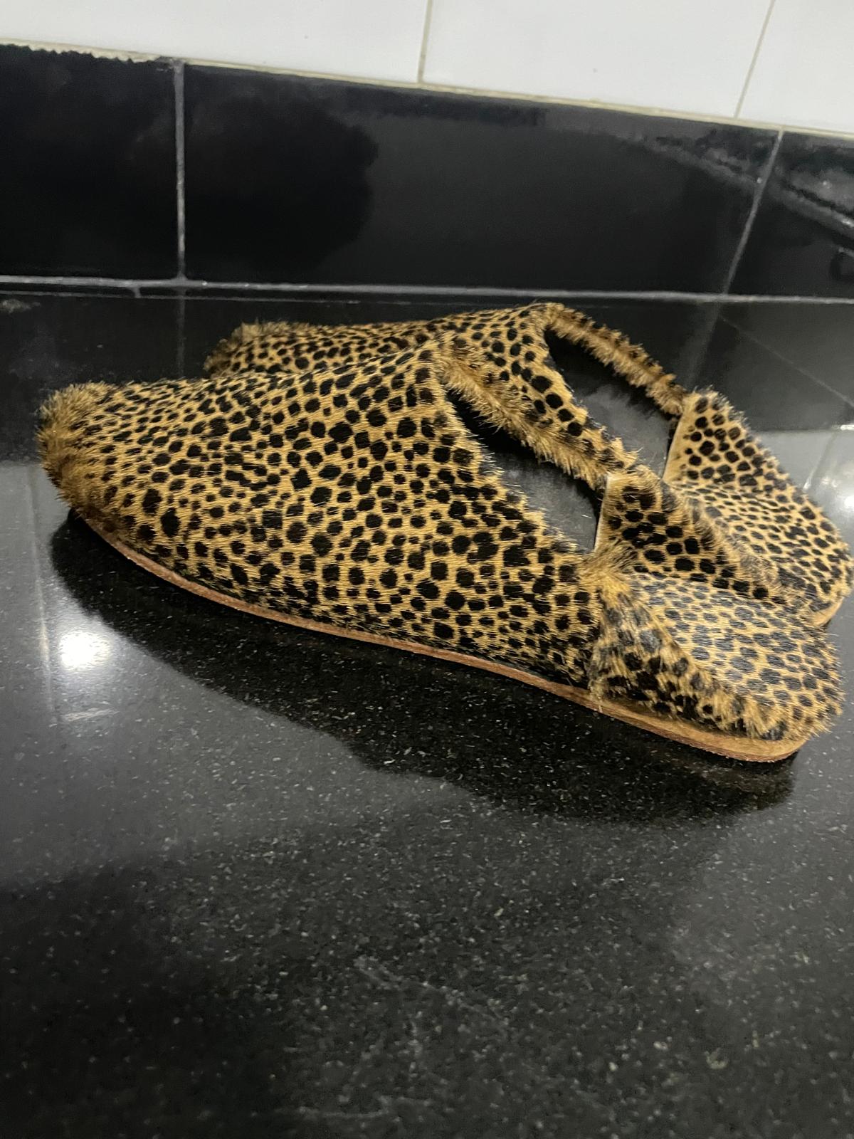 Babouche en cuir et peau de vache imprimé léopard, élégante et confortable.Peut être portée en intérieur comme en extérieur grâce à sa semelle cuir.