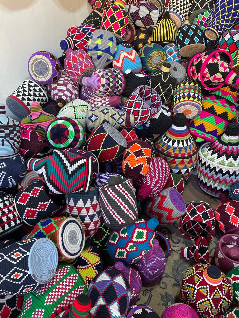 Les Marocains ont l’habitude d’utiliser des boîtes en doum colorées dans leur vie quotidienne. Aujourd’hui, elles sont détournées pour devenir des éléments décoratifs très attrayants. Les couleurs vives sont très à la mode en ce moment, elles donnent du peps à votre intérieur.