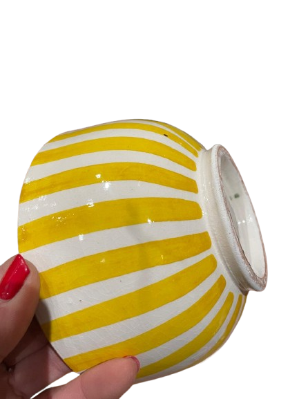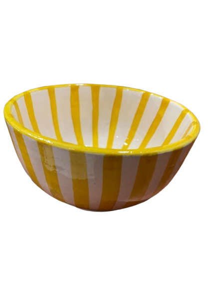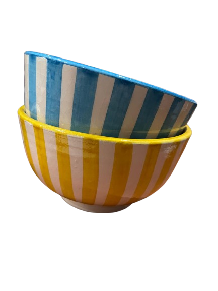 Ce bol en céramique se distingue par ses rayures vives, disponibles en jaune ou en bleu, apportant fraîcheur et luminosité à votre table. Chaque couleur est soigneusement appliquée pour un rendu harmonieux et durable.