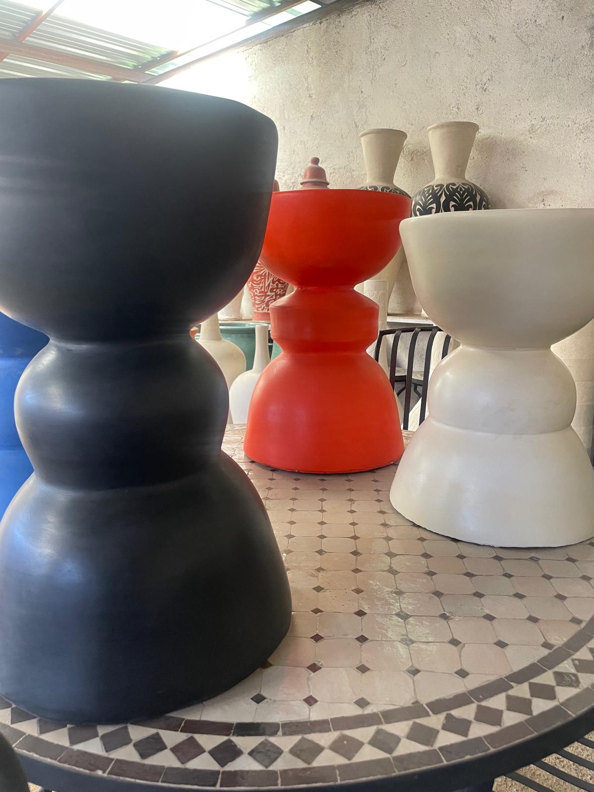 Bout de table en béton avec finition tadelakt, aux formes sculpturales et aux couleurs modernes. Peut être utilisé comme table d’appoint ou assise.