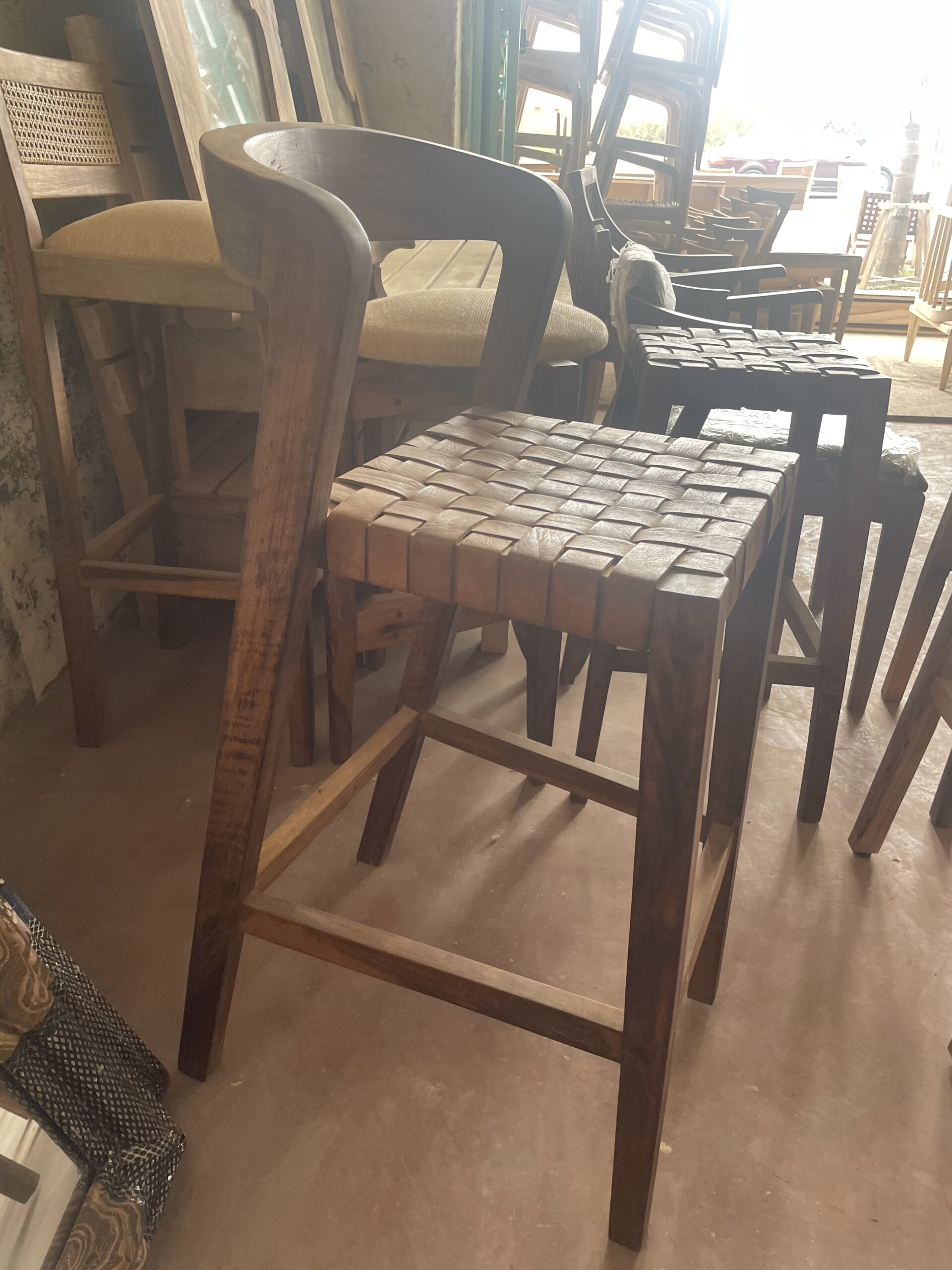On peut admirer les courbes parfaites de cette chaise haute en bois de noyer et assise en cuir. Des artisans talentueux à Marrakech la fabriquent entièrement à la main. Cette chaise offre un confort optimal grâce à ses formes modernes et confortables.