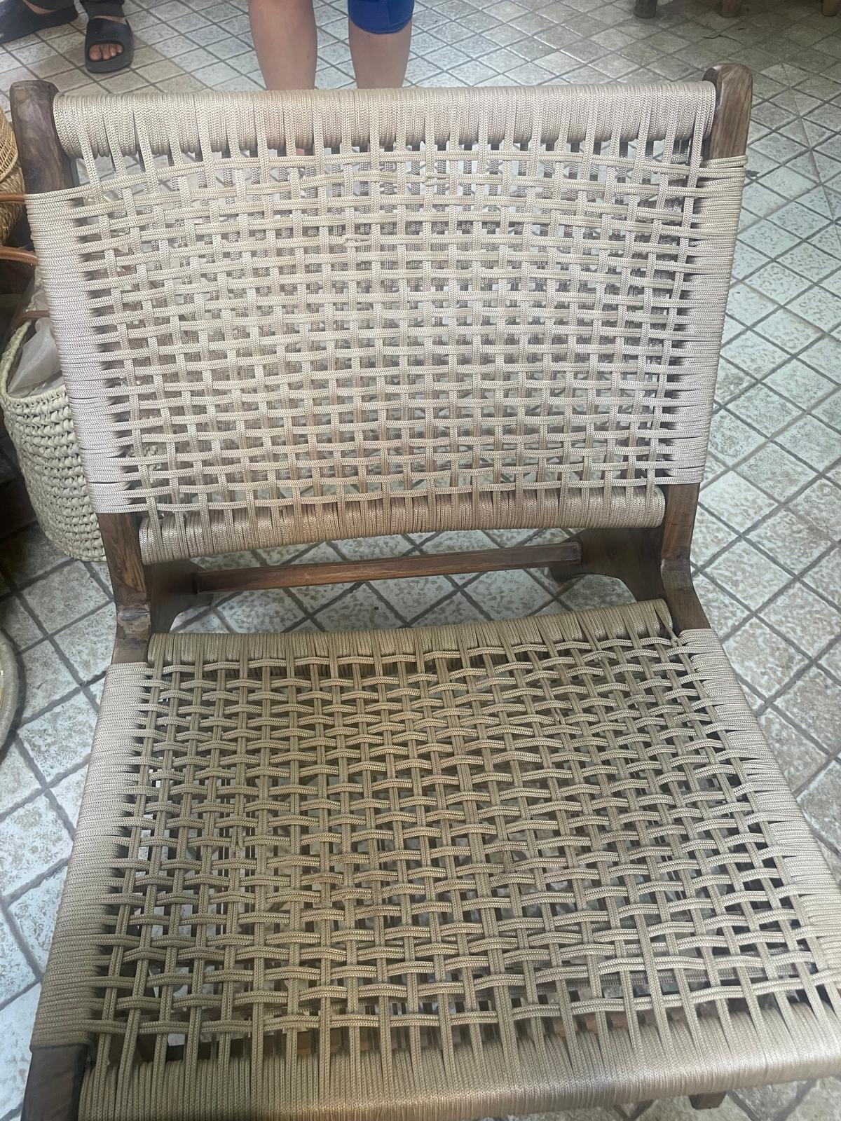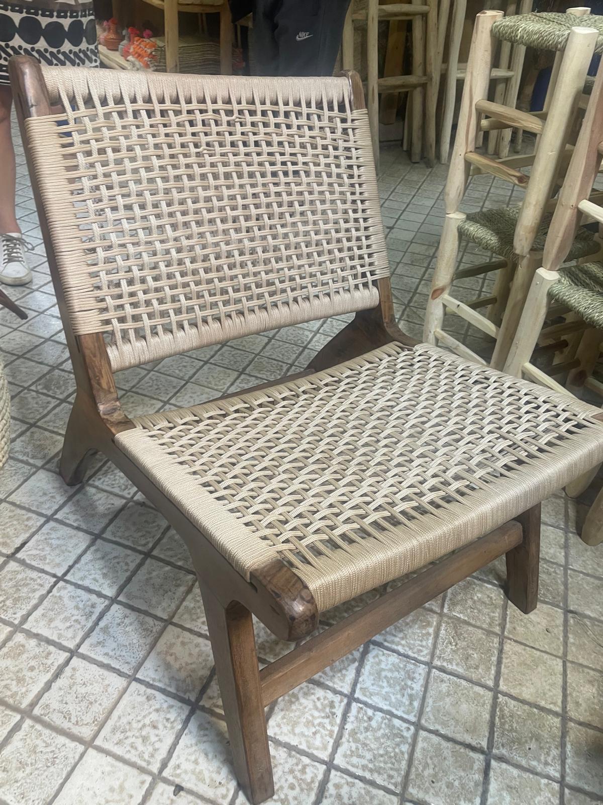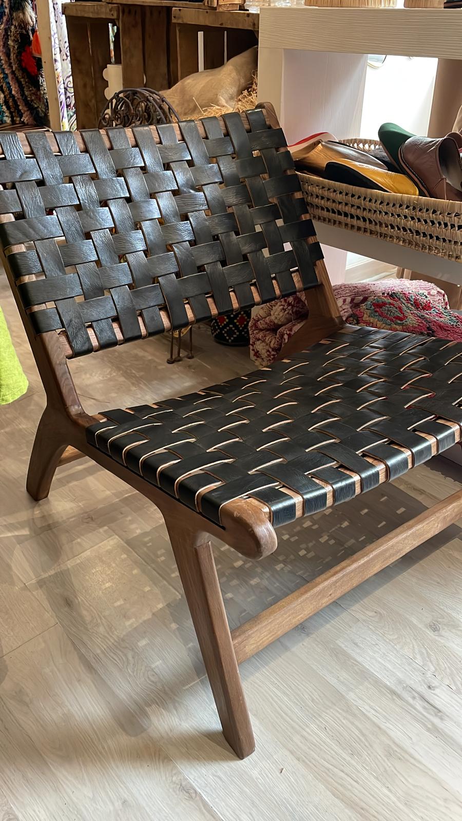 Fauteuil artisanal en bois de noyer, avec assise et dossier tressés à la main. Disponible en cuir, corde type macramé ou fibre synthétique, il allie confort, élégance et design épuré.