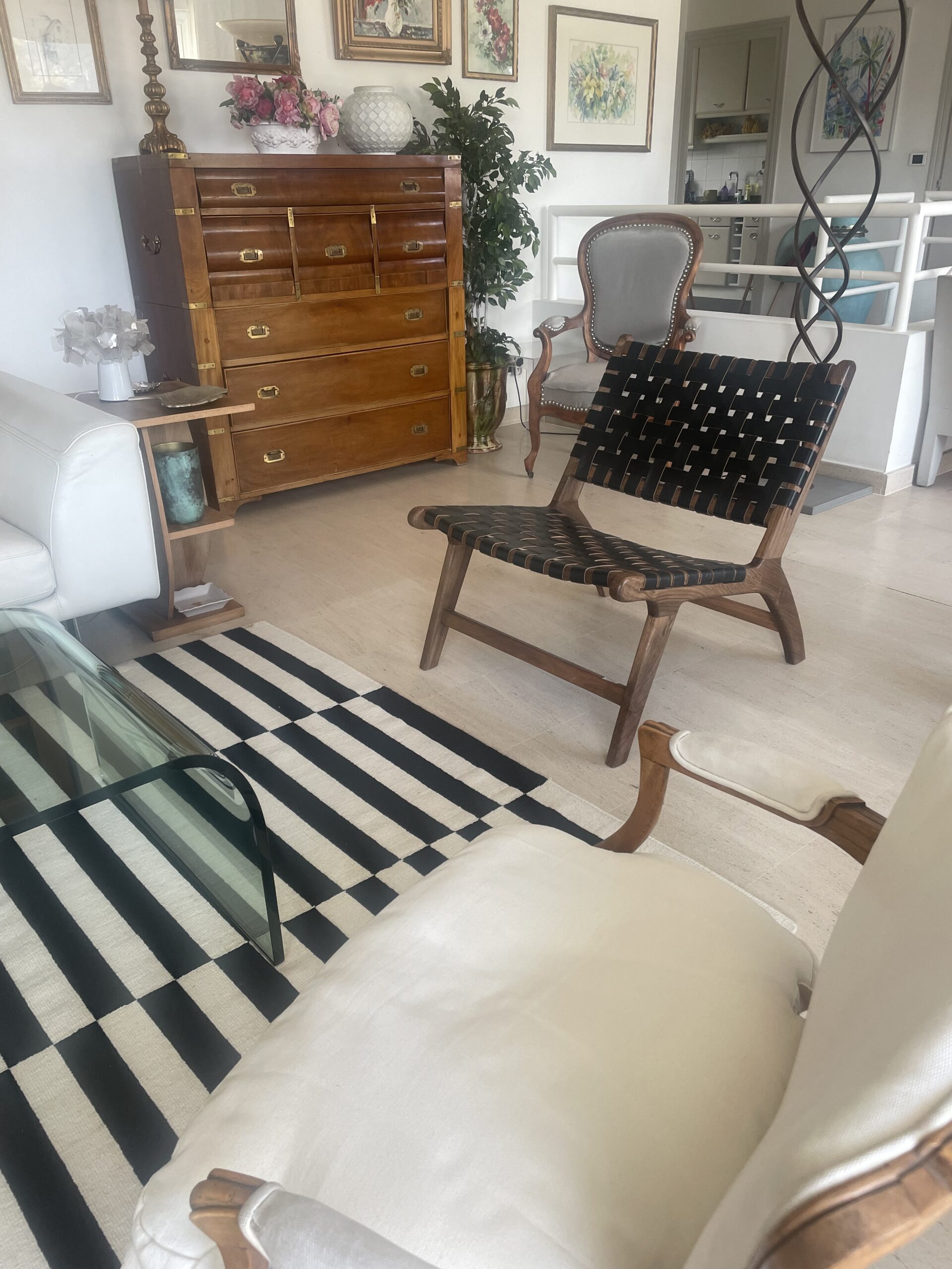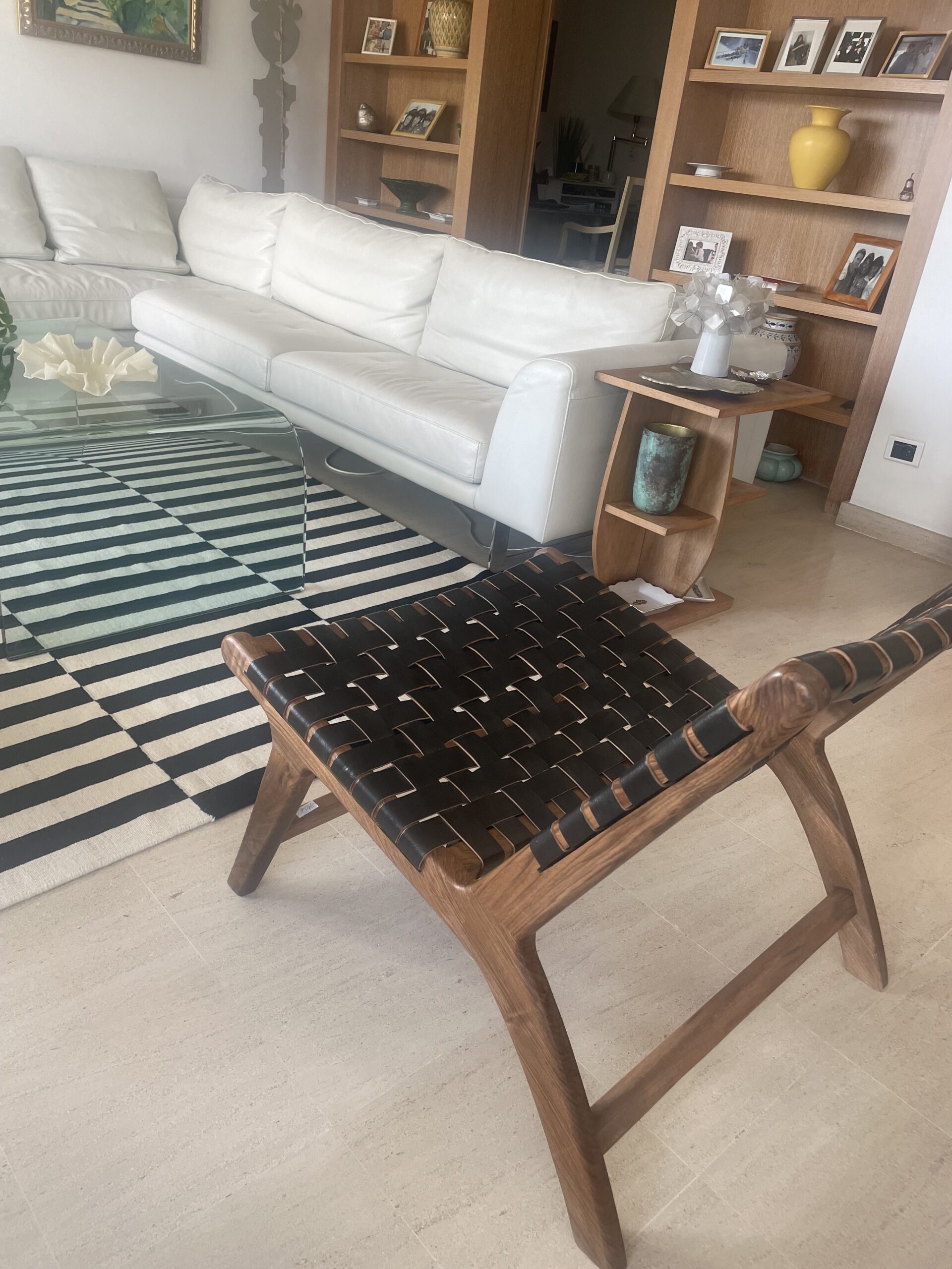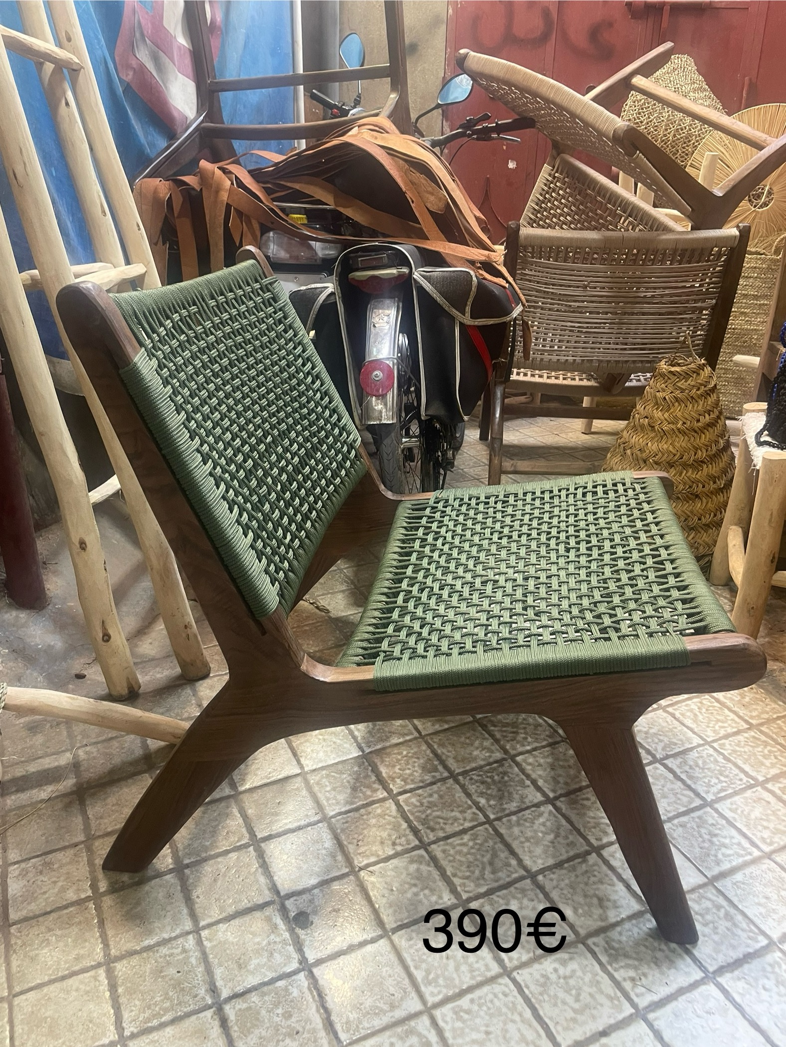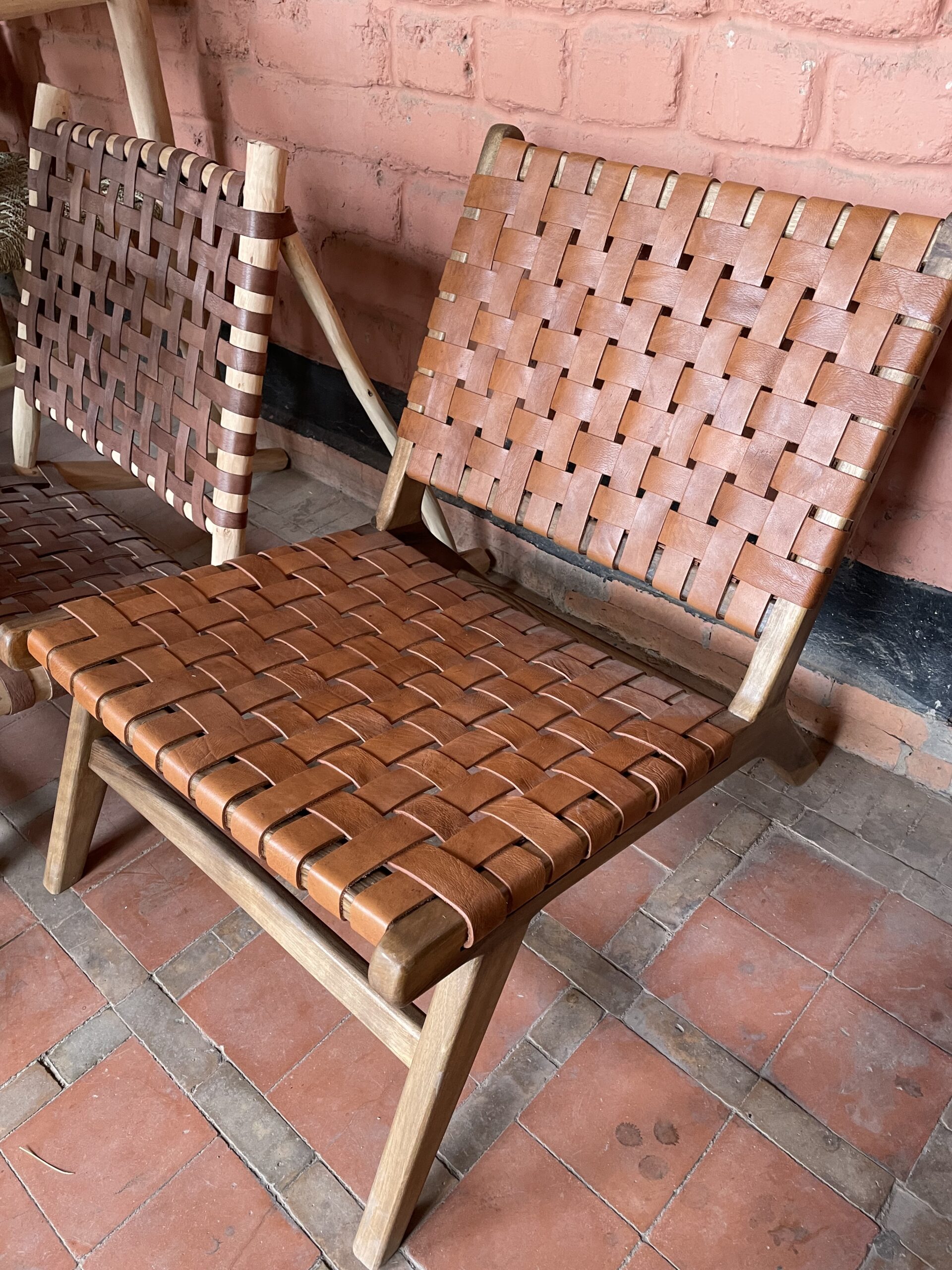 Fauteuil artisanal en bois de noyer, avec assise et dossier tressés à la main. Disponible en cuir, corde type macramé ou fibre synthétique, il allie confort, élégance et design épuré.