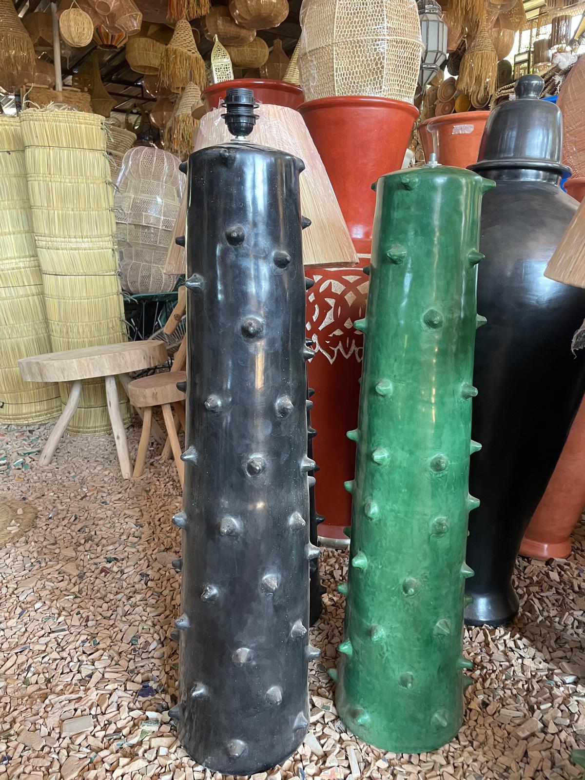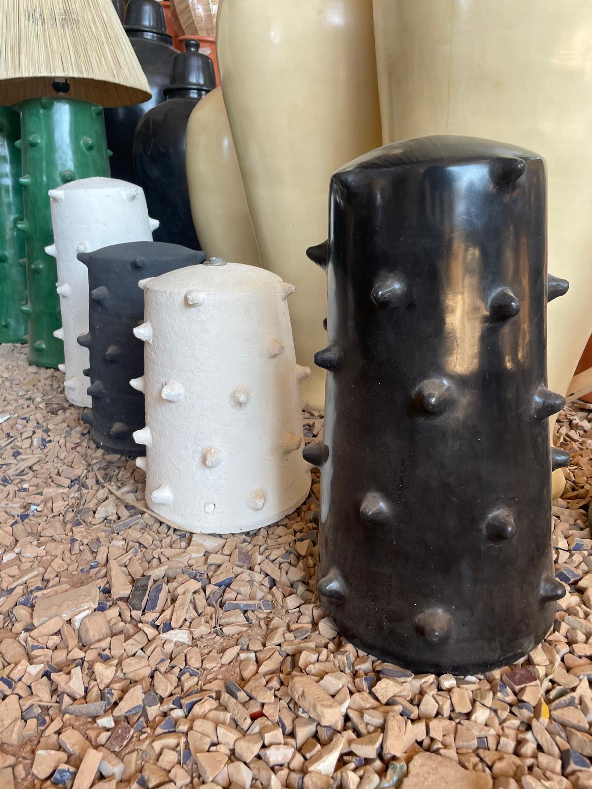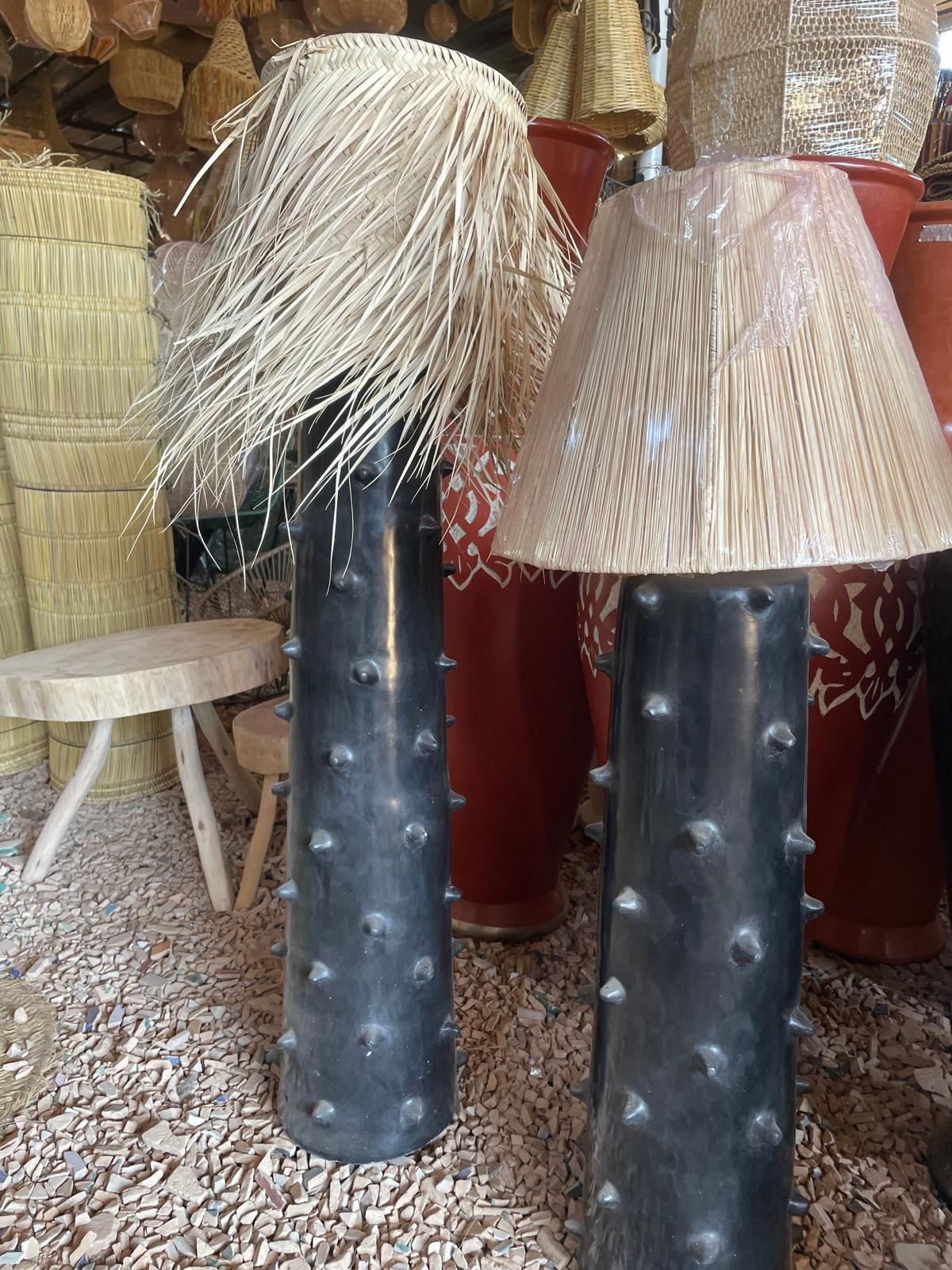 Cette lampe artisanale en poterie se distingue par sa silhouette élancée et son caractère sculptural. Façonnée à la main, elle révèle un travail de la matière riche en reliefs, marqué par des picots en surface qui rappellent certaines poteries du sud marocain et évoquent subtilement une inspiration architecturale.