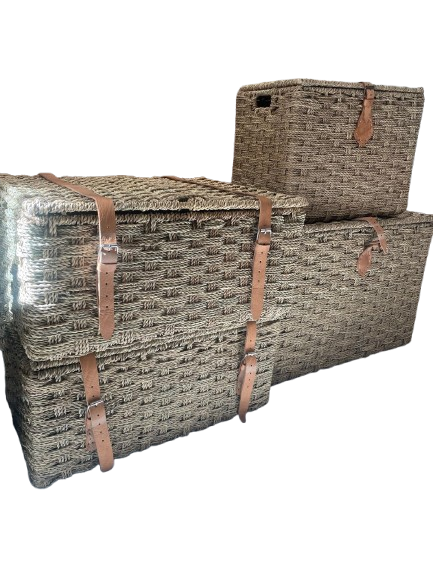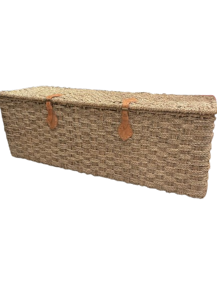 Grande malle de rangement artisanale réalisée à la main au Maroc, en fibres naturelles de doum et structure métallique.
