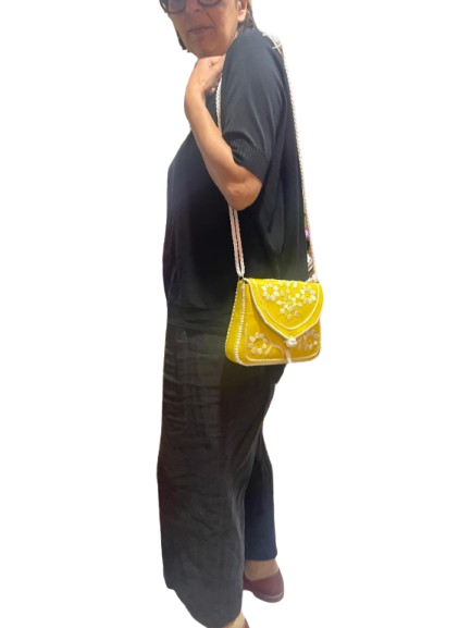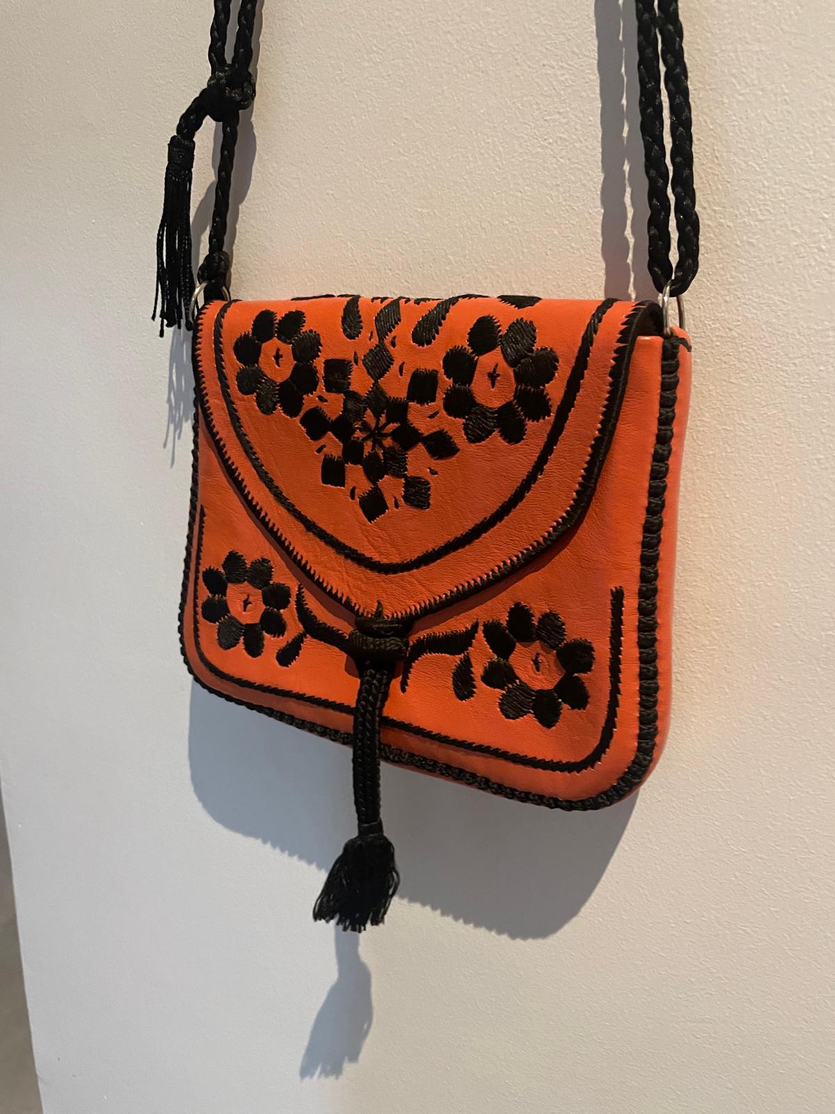 Petit sac en cuir brodé disponible en orange ou jaune, réalisé à la main.