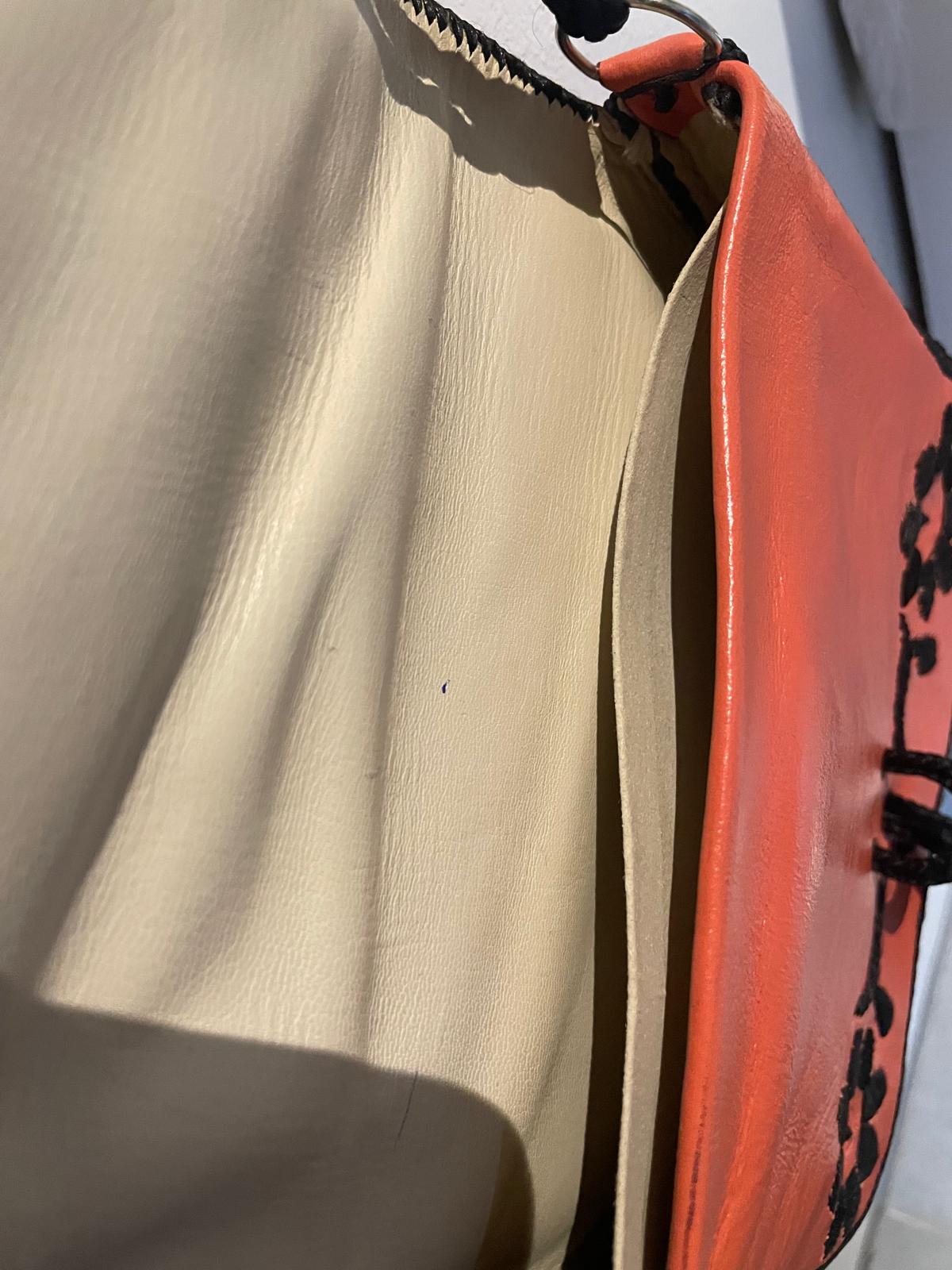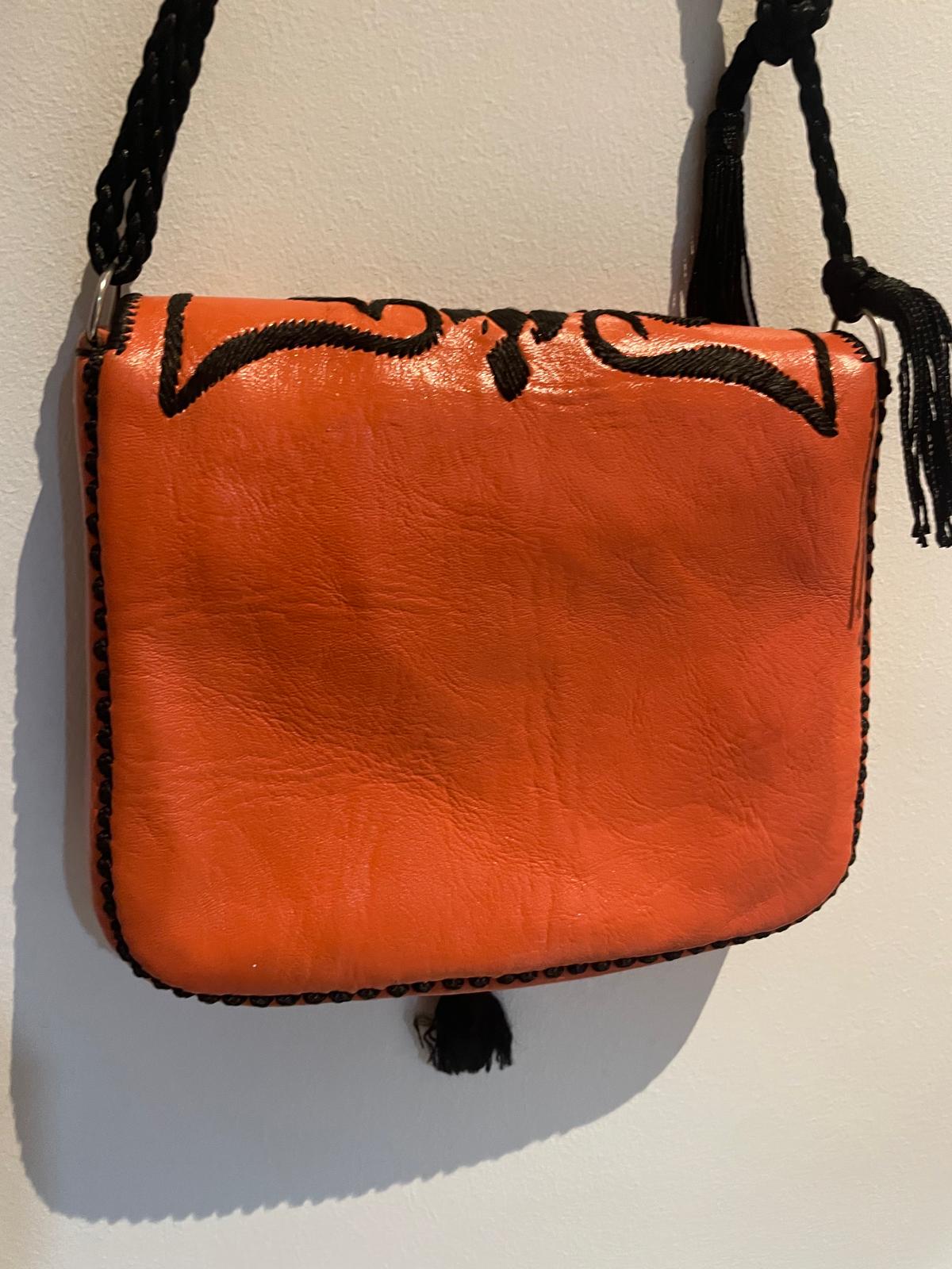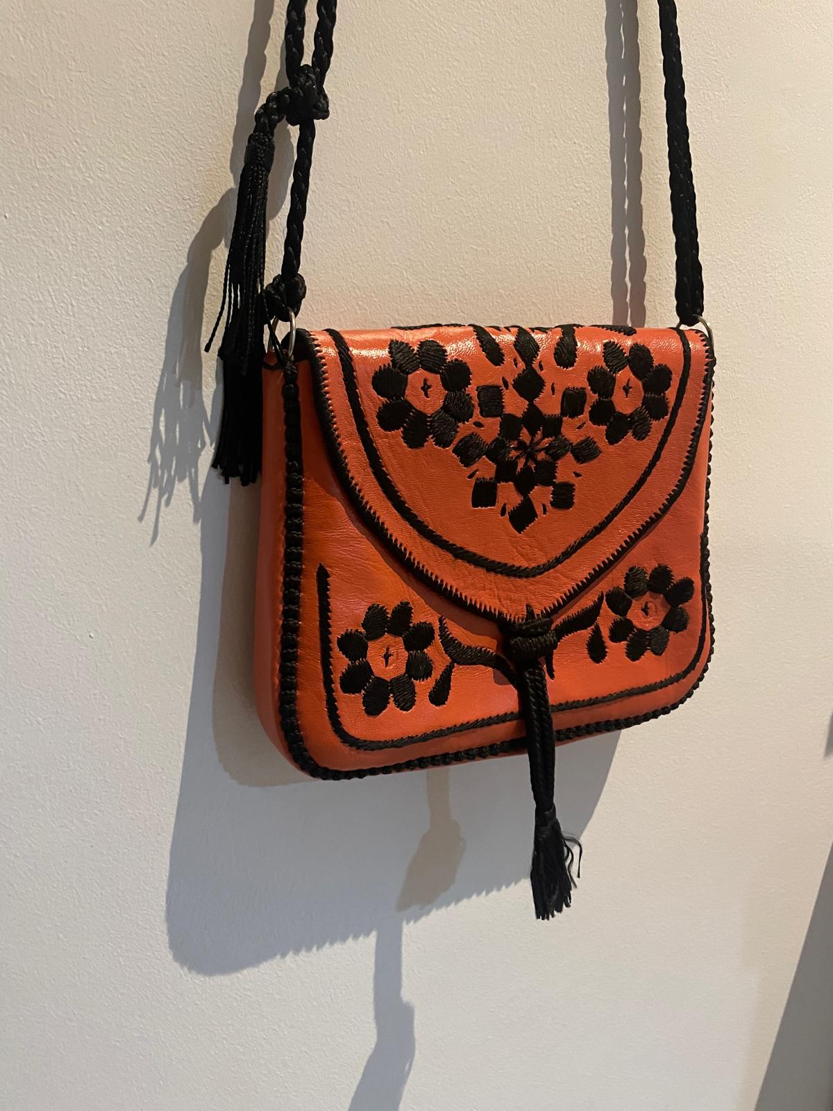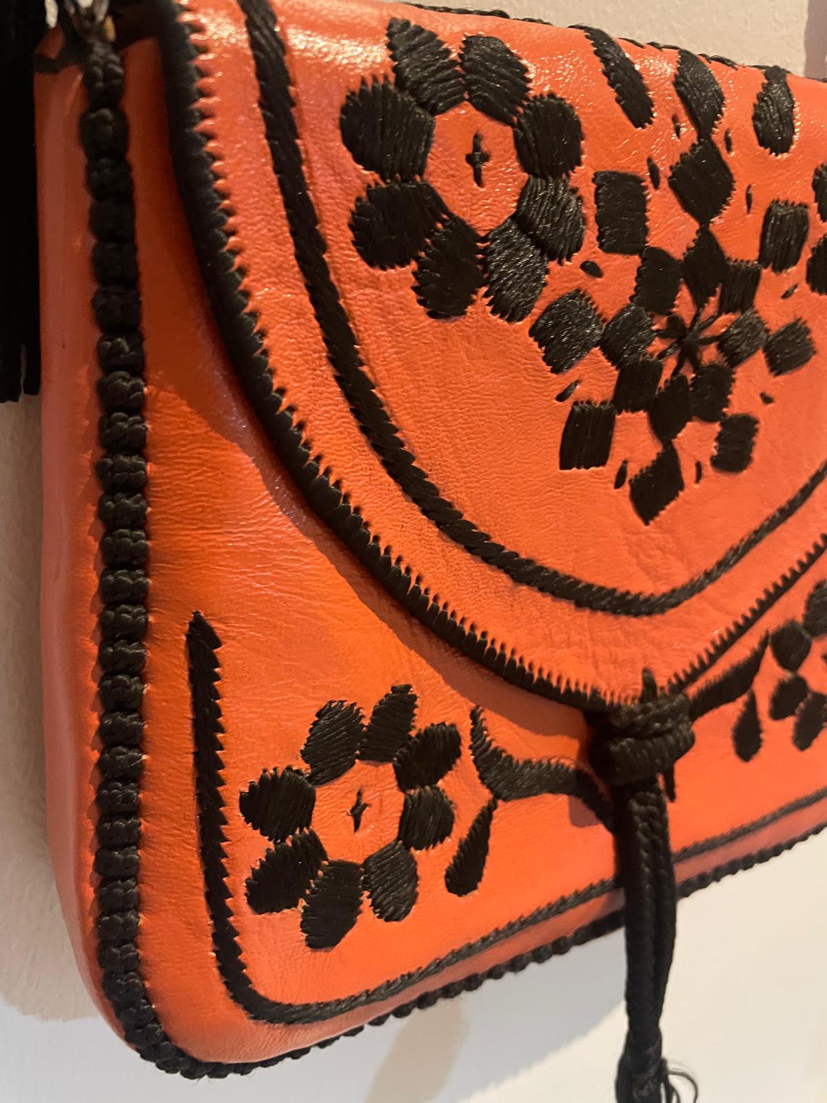 Ce sac en cuir est entièrement réalisé à la main selon le savoir-faire artisanal marocain. Sa broderie noire contraste avec le cuir orange pour créer une pièce :