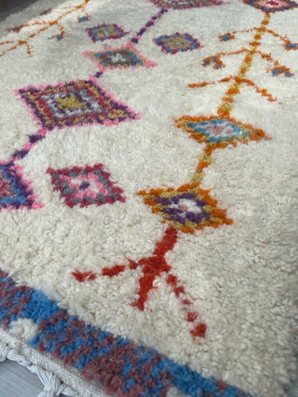 Contrairement aux tapis plus sobres comme les Beni Ouarain, l’Azilal se distingue par son originalité et sa liberté créative. Chaque pièce est improvisée sur le métier à tisser, ce qui en fait une œuvre vivante et toujours différente.