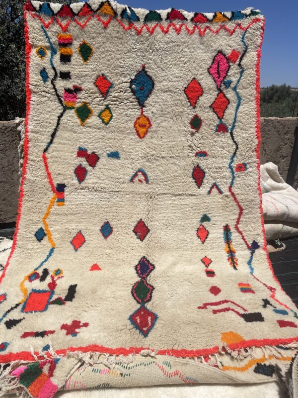 Contrairement aux tapis plus sobres comme les Beni Ouarain, l’Azilal se distingue par son originalité et sa liberté créative. Chaque pièce est improvisée sur le métier à tisser, ce qui en fait une œuvre vivante et toujours différente.