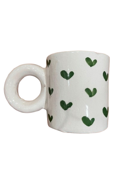 Cette tasse à café en céramique se distingue par son design contemporain et son esprit résolument joyeux.Sa grande anse arrondie, à la fois graphique et confortable, lui confère une véritable personnalité et une prise en main agréable. Les motifs cœurs, appliqués sur un fond clair, apportent une touche ludique et moderne, sans tomber dans l’excès décoratif.